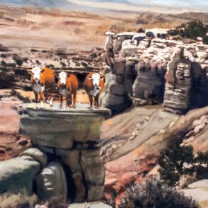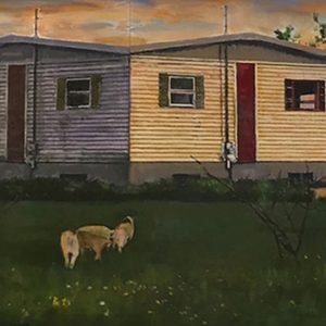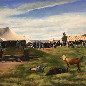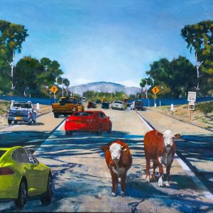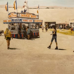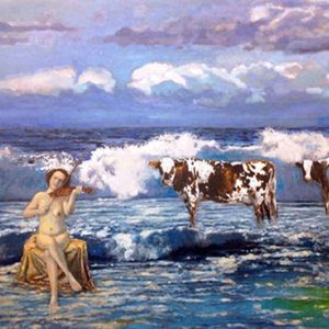 Marjorie and Bob Moskowitz created a new persona, (MB Mosk) when they began collaborating, separate from their individual studio practices. These works are a curious hybrid only slightly resembling their own work. The process attempts to create a seamless blending to appear as a single artist has produced the painting. They draw on their shared approach to looking at the peculiar nature of people and the world. Their sense of irony and humor is a vehicle to allude to a deeper meaning below the surface.