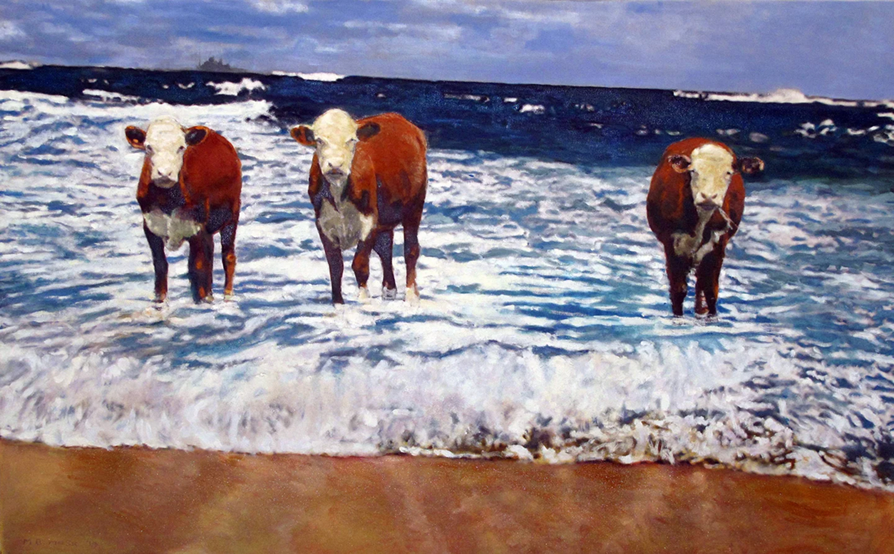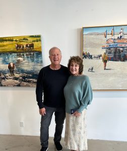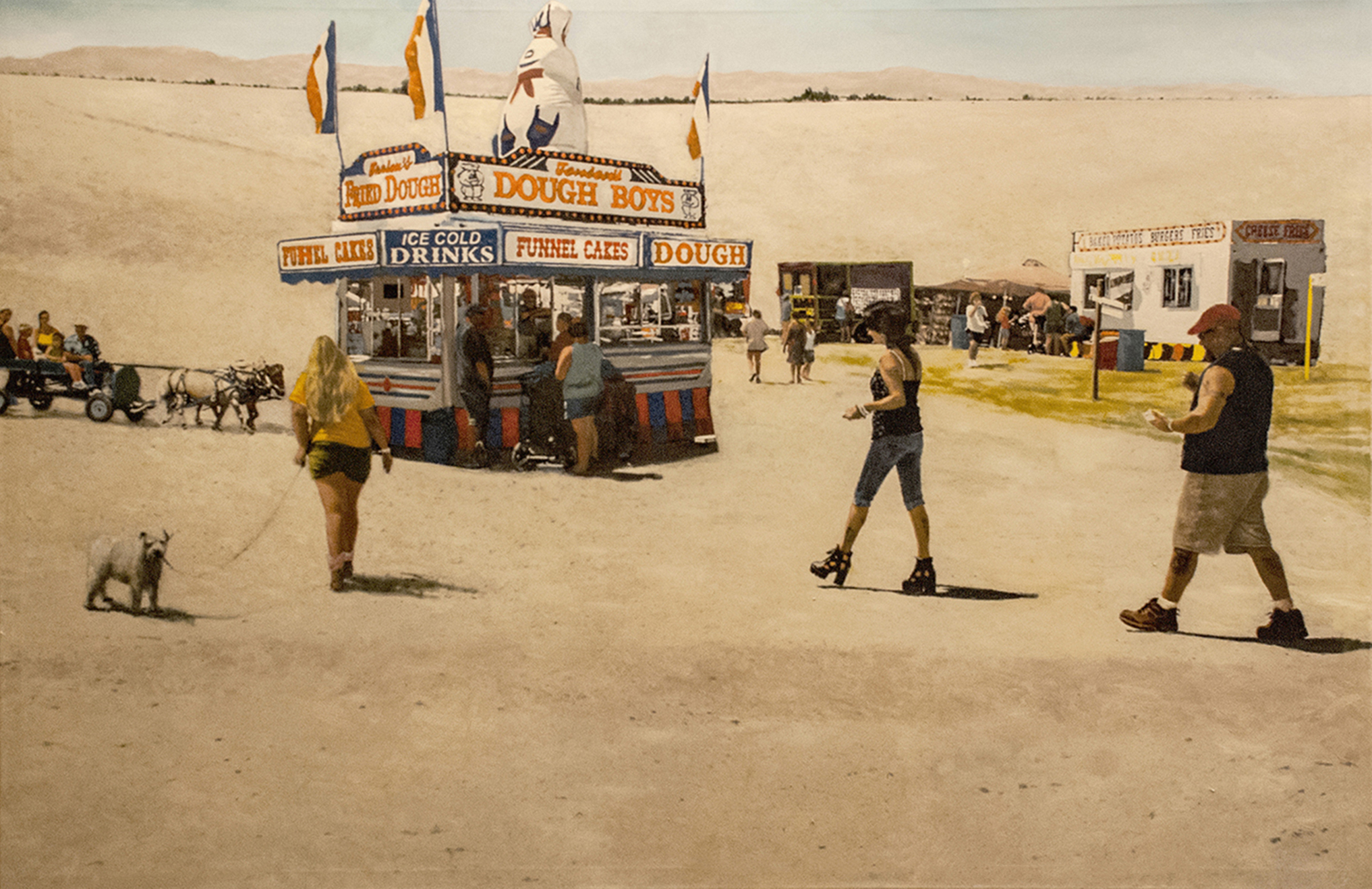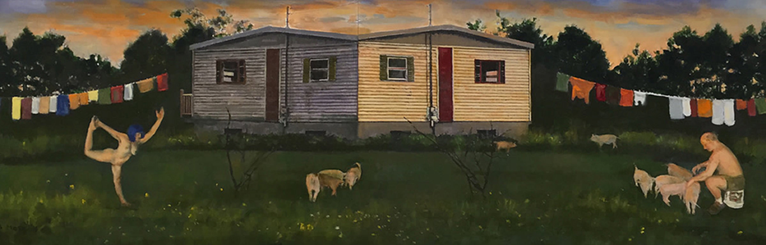 Marjorie and Bob Moskowitz created a new persona, (MB Mosk) when they began collaborating, separate from their individual studio practices. These works are a curious hybrid only slightly resembling their own work. The process attempts to create a seamless blending to appear as a single artist has produced the painting. They draw on their shared approach to looking at the peculiar nature of people and the world. Their sense of irony and humor is a vehicle to allude to a deeper meaning below the surface.