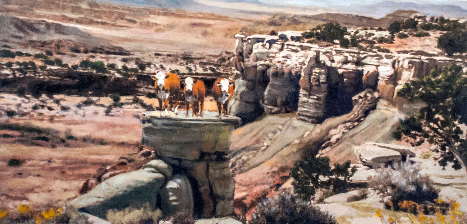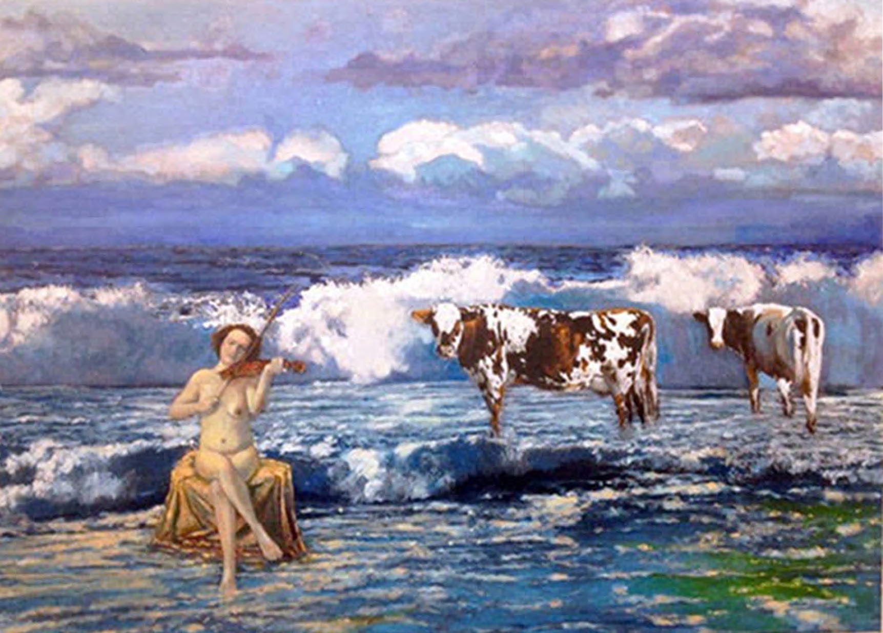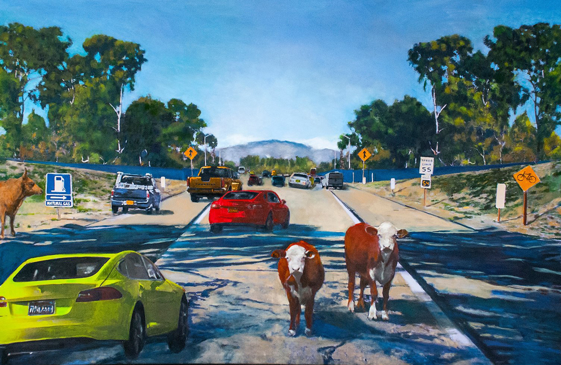 Marjorie and Bob Moskowitz created a new persona, (MB Mosk) when they began collaborating, separate from their individual studio practices. These works are a curious hybrid only slightly resembling their own work. The process attempts to create a seamless blending to appear as a single artist has produced the painting. They draw on their shared approach to looking at the peculiar nature of people and the world. Their sense of irony and humor is a vehicle to allude to a deeper meaning below the surface.