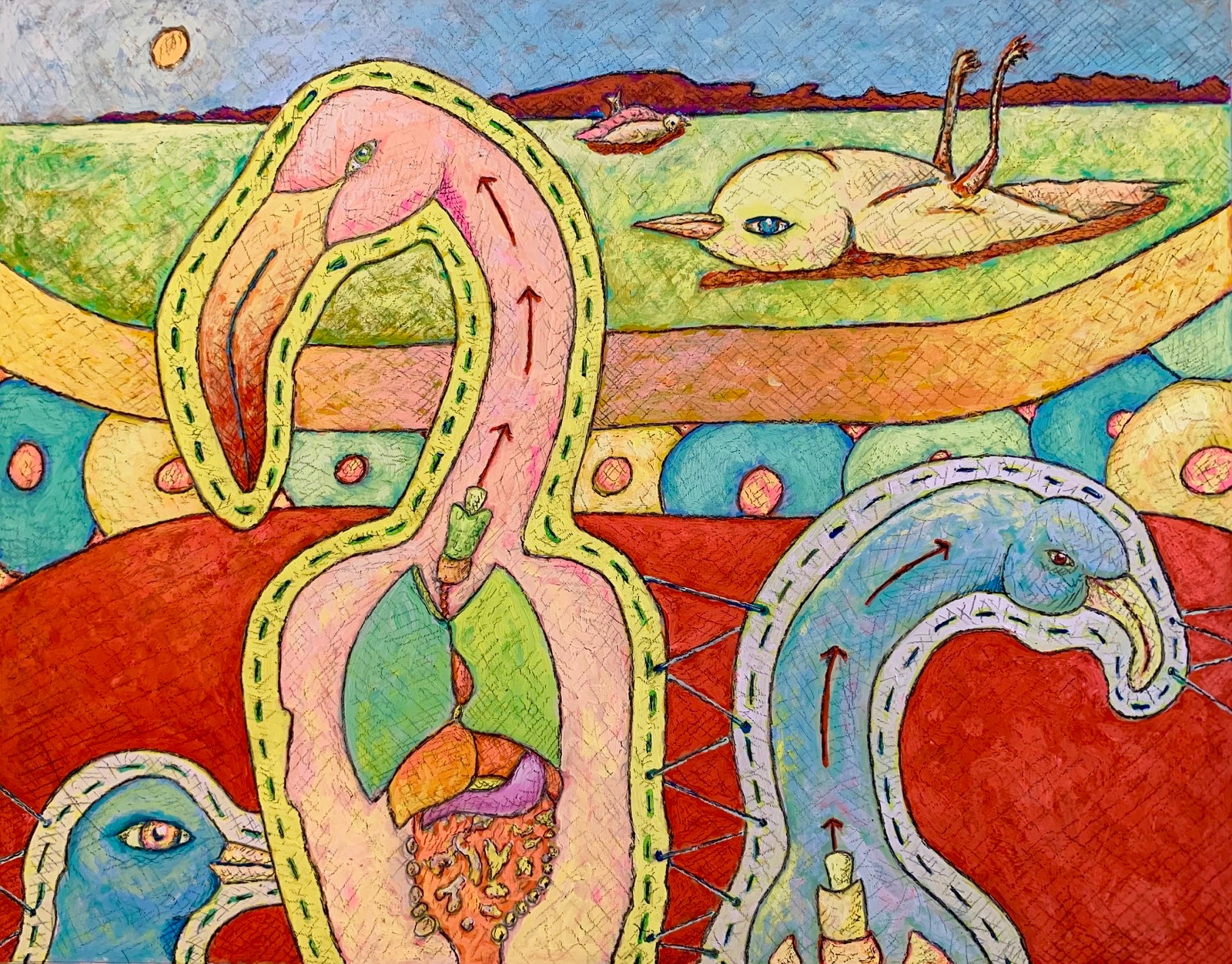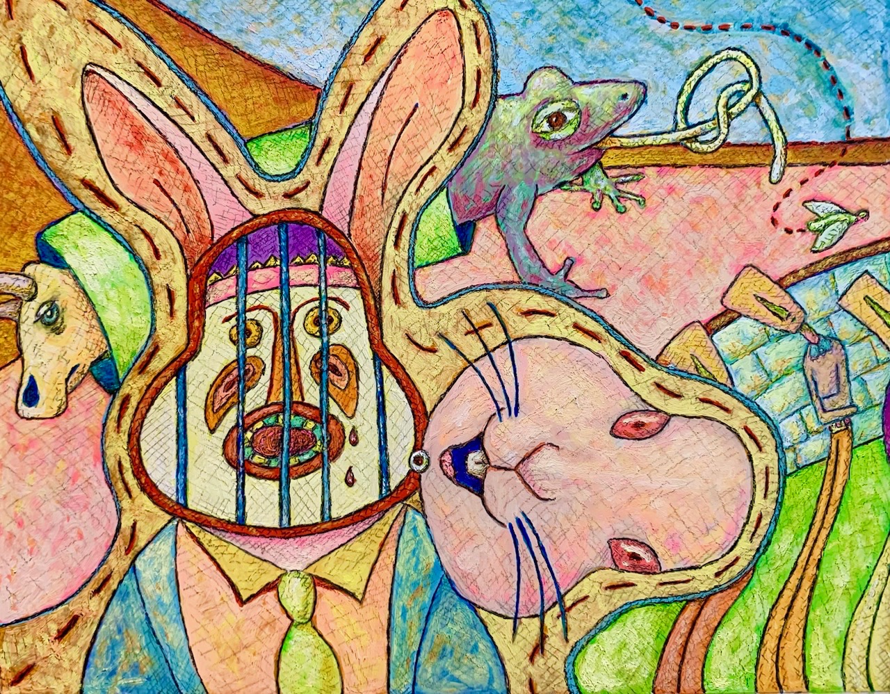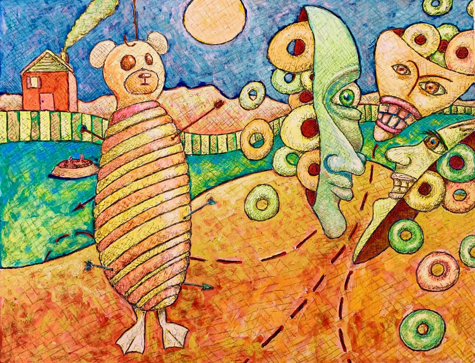 I work in a style I call “Suburban Primitive”. This style combines my interest in the origins and functions of art along with life in the suburbs. For me, the draw of art lies not in the depiction of physical reality but rather the representation of my emotional, psychological and intellectual reactions to the environment in which I live. In general painting for me is visual thinking, it is a way of making sense finding connections and organizing the seemingly incongruent thoughts that bounce around in my head. Ultimately I hold the belief that all things, within our existence, are somehow tied together and my task, as an artist, is to find and explore these ties.