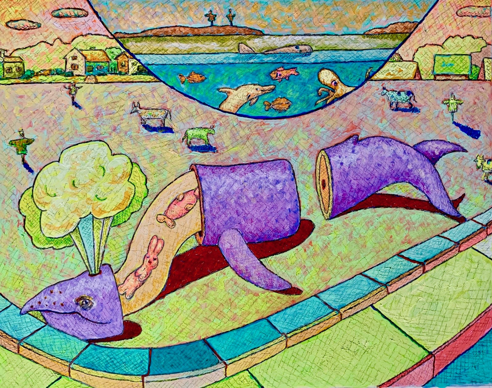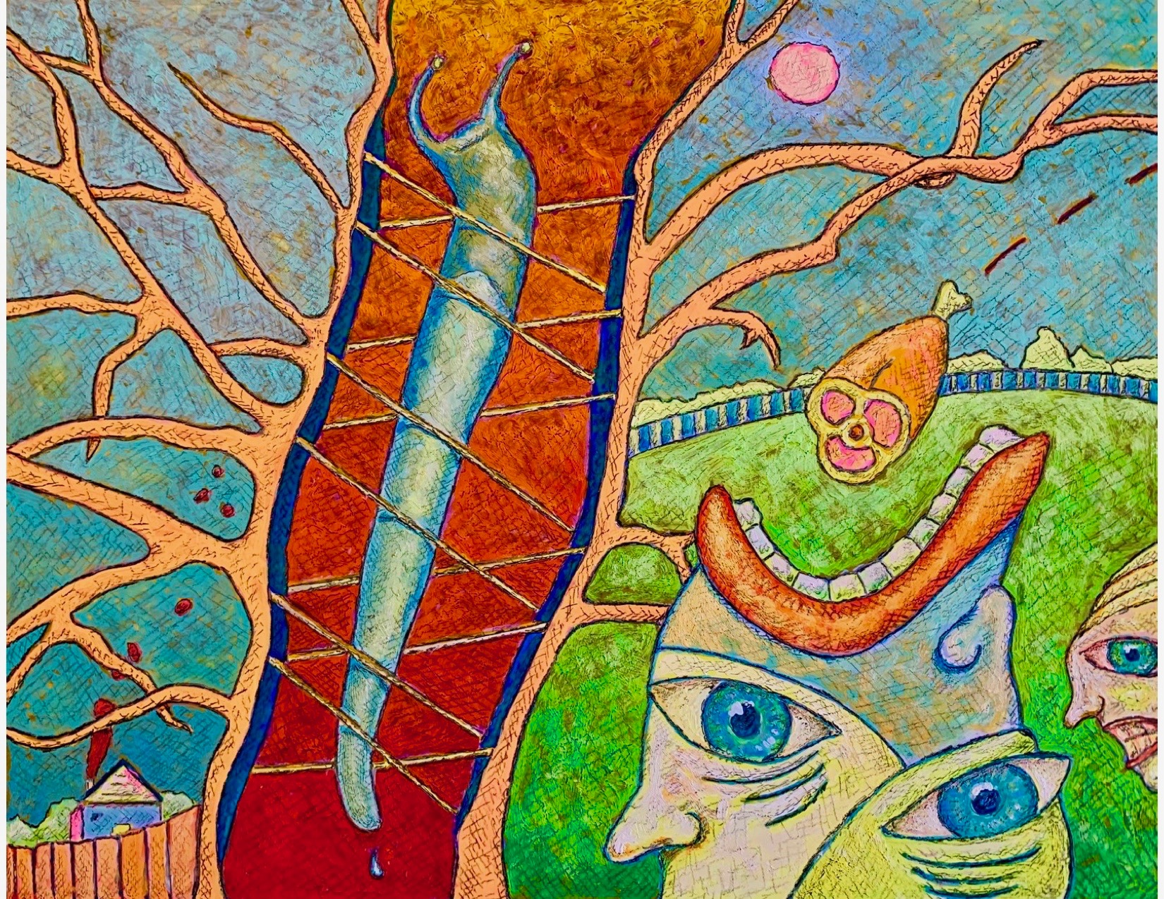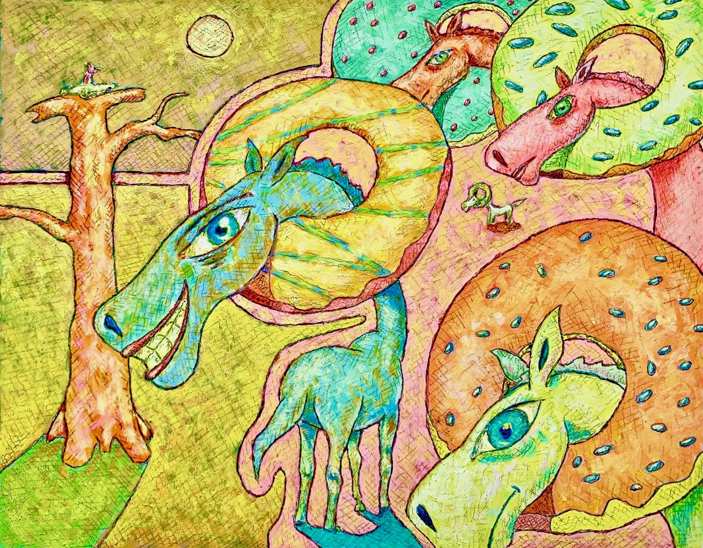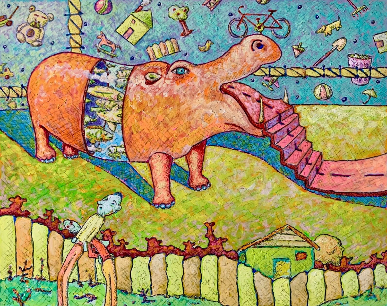 I work in a style I call “Suburban Primitive”. This style combines my interest in the origins and functions of art along with life in the suburbs. For me, the draw of art lies not in the depiction of physical reality but rather the representation of my emotional, psychological and intellectual reactions to the environment in which I live. In general painting for me is visual thinking, it is a way of making sense finding connections and organizing the seemingly incongruent thoughts that bounce around in my head. Ultimately I hold the belief that all things, within our existence, are somehow tied together and my task, as an artist, is to find and explore these ties.